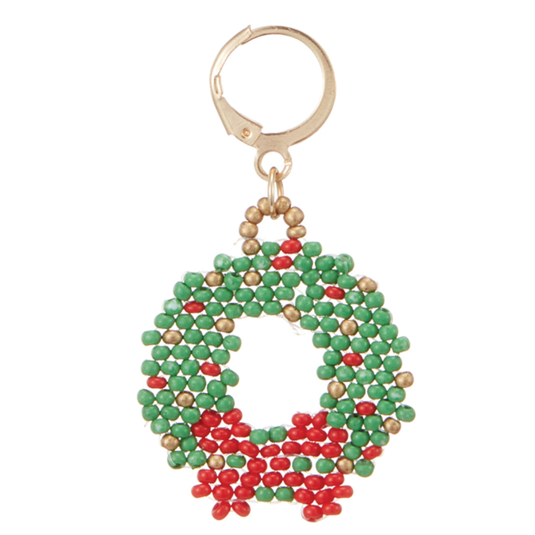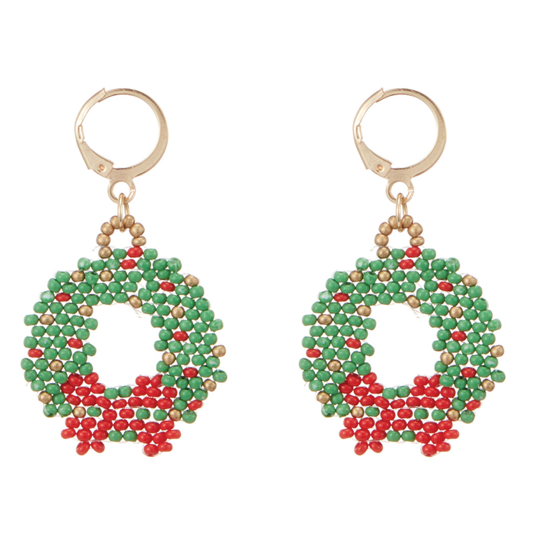 Christmas Wreath Seed Bead Hinged Hoop Earrings